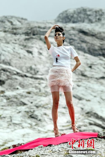 Super models from a Chinese reality show wearing 12cm high heels walk on the 50-meter red carpet on Dolomiti Di Brenta, the Alps in Italy on Sept. 10, 2014. (CNS/GXTV)