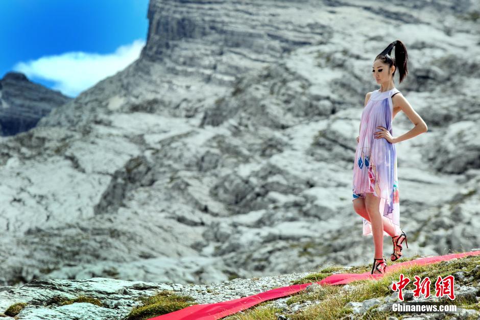 Super models from a Chinese reality show wearing 12cm high heels walk on the 50-meter red carpet on Dolomiti Di Brenta, the Alps in Italy on Sept. 10, 2014. (CNS/GXTV)