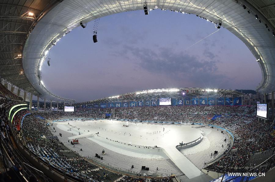 Photo taken on Sept. 19, 2014 shows a general view of the welcoming performance of the 17th Asian Games at the Incheon Asiad Main Stadium in Incheon, South Korea, Sept. 19, 2014. (Xinhua/Wang Peng)