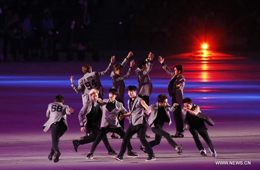 South Korean pop group EXO performs before the opening ceremony of the 17th Asian Games at the Incheon Asiad Main Stadium in Incheon, South Korea, Sept. 19, 2014. (Xinhua/Lin Yiguang)