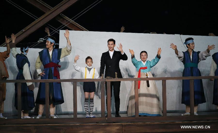 South Korean actor Kim Soo Hyun (C) performs during the opening ceremony of the 17th Asian Games at the Incheon Asiad Main Stadium in Incheon, South Korea, Sept. 19, 2014. (Xinhua/Meng Yongmin)