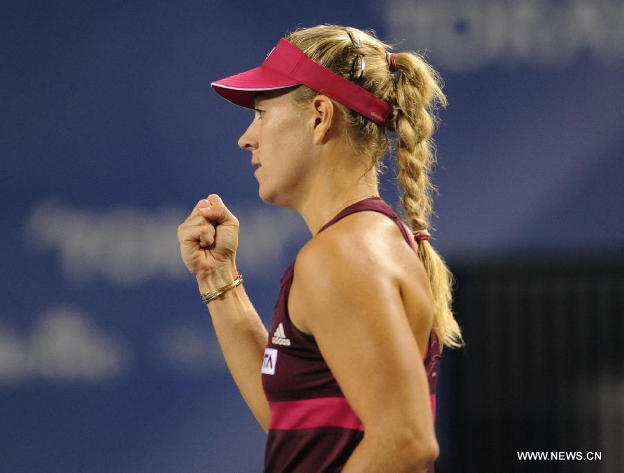 | Angelique Kerber of Germany reacts after scoring a point during the third round match against Dominika Cibulkova of Slovakia at the Toray Pan Pacific Open tournament in Tokyo, Japan, Sept. 19, 2014. (Xinhua/Stringer) |