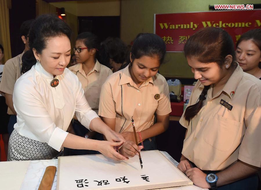 Peng Liyuan (L), wife of Chinese President Xi Jinping, teaches students to use Chinese writing brush at the Tagore International School in New Delhi, India, Sept 18, 2014. (Xinhua/Ma Zhancheng)
