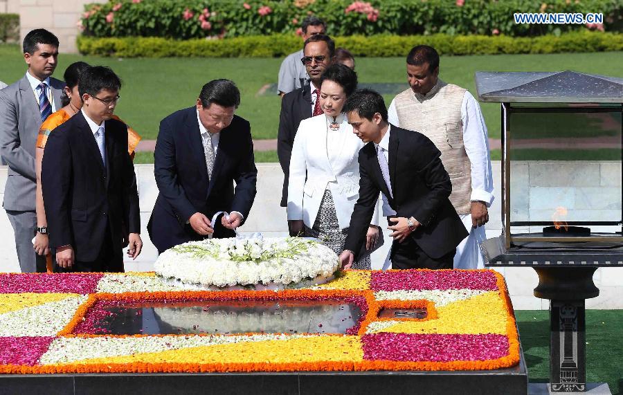 | Chinese President Xi Jinping (2nd L front) and his wife Peng Liyuan lay a wreath to the memorial of Mahatma Gandhi in New Delhi, India, Sept. 18, 2014. (Xinhua/Pang Xinglei) |