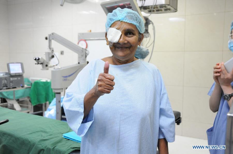 A patient thumbs up after a free cataract surgery in Colombo, Sri Lanka, Sept. 11, 2014. "Tribute to Love", a China-Sri Lanka free cataract surgery campaign started on Sept. 11 in Colombo, aiming to help 1000 cataract patients. (Xinhua/Yang Meiju)