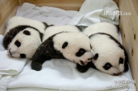 The first surviving panda triplets in the world open their eyes on Sept. 18, 2014. (Photo/Weibo)