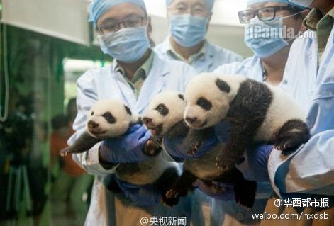 The first surviving panda triplets in the world open their eyes on Sept. 18, 2014. (Photo/Weibo)