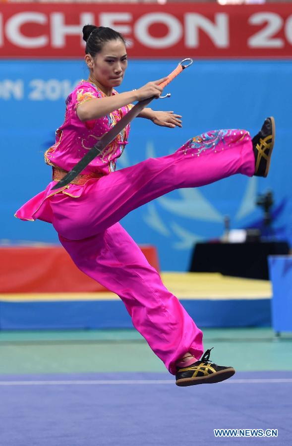 Wei Hong of China performs during the women's nandao of Wushu competition at the 17th Asian Games in Incheon, South Korea, Sept. 20, 2014. (Xinhua/Xie Haining)