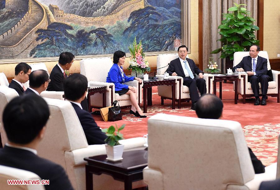 | Zhang Dejiang (2nd R), chairman of the Standing Committee of China's National People's Congress (NPC), meets with a delegation of Hong Kong's New People's Party headed by the Party Chair Regina Ip (3rd R), in Beijing, capital of China, Sept. 19, 2014. (Xinhua/Liu Jiansheng) |