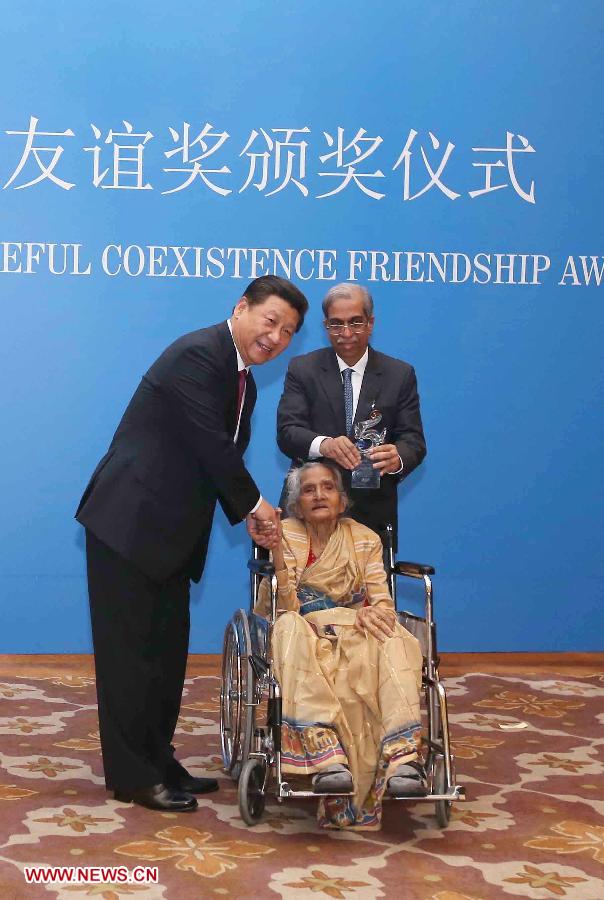 Chinese President Xi Jinping (L) meets with Indian groups and individuals who received friendship awards during the Ceremony for the Five Principles of Peaceful Coexistence Friendship Award in New Delhi, India, Sept. 19, 2014. (Xinhua/Pang Xinglei)