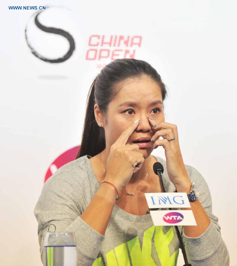 Chinese famous tennis player Li Na reacts during her retirement press conference in Beijing, capital of China, Sept. 21, 2014. China's first and only Grand Slam winner Li Na formally announced her retirement on Sept. 19, leaving Chinese tennis yearning for the next superstar. (Xinhua/Li Wen)