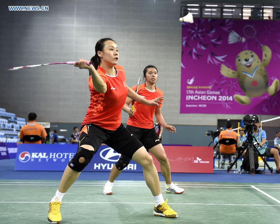 Zhao Yunlei (front) and Tian Qing of China compete against Takahashi Ayaka and Matsutomo Misaki of Japan during the women's badminton team semi-final match at the 17th Asian Games in Incheon, South Korea, Sept. 21, 2014. China won 3-1. (Xinhua/Ye Pingfan)