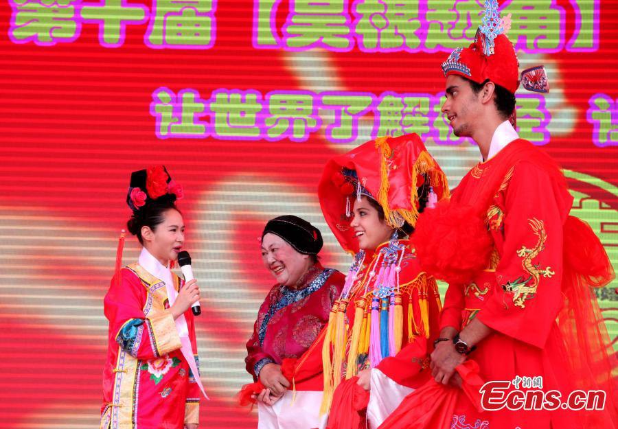 A traditional Chinese wedding ceremony for 20 foreign couples is held in Fengjing, an ancient water town of Shanghai on Sunday, September 21, 2014. Couples from 14 countries including India, Singapore, Afghanistan, Spain, and Poland tied the knot and experienced local ethnic customs at the event.