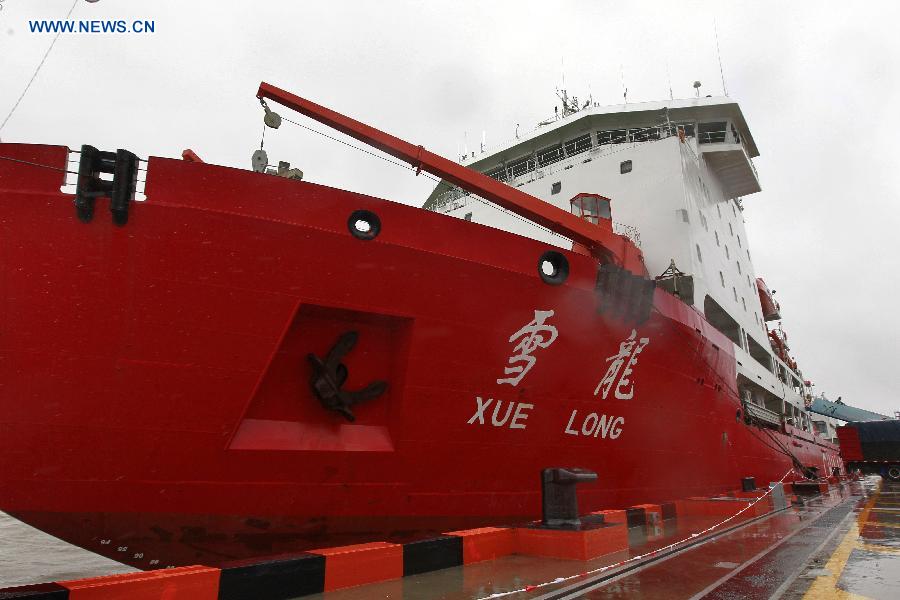 Icebreaker Xuelong, or "Snow Dragon," berthes at its home port after a two-and-a-half-month mission, in Shanghai, east China, Sept. 23, 2014. Xuelong set out from Shanghai on July 11 and has since traveled some 22,000 km to explore key areas such as the Bering Sea, the Chukchi Sea and the Canada Basin. It traveled as far as 81.11 degrees north latitude and 156.30 degrees east longitude, the team said. (Xinhua/Ding Ting)