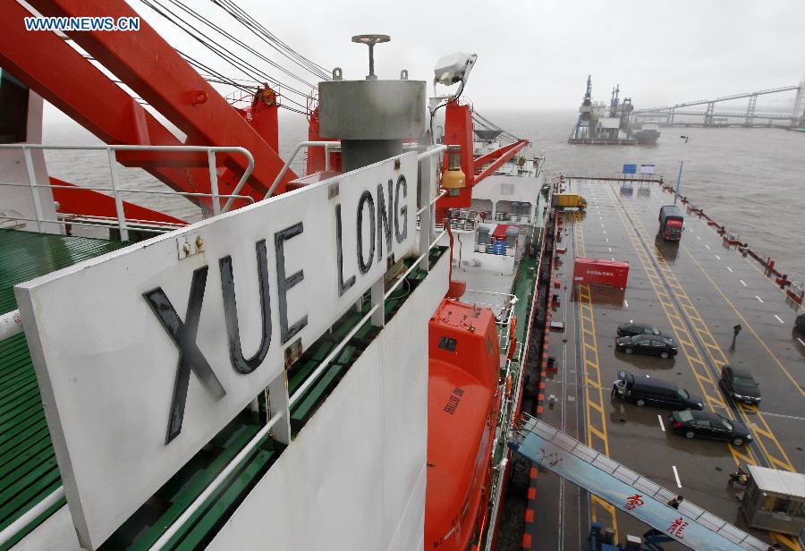 Icebreaker Xuelong, or "Snow Dragon," berthes at its home port after a two-and-a-half-month mission, in Shanghai, east China, Sept. 23, 2014. Xuelong set out from Shanghai on July 11 and has since traveled some 22,000 km to explore key areas such as the Bering Sea, the Chukchi Sea and the Canada Basin. It traveled as far as 81.11 degrees north latitude and 156.30 degrees east longitude, the team said. (Xinhua/Ding Ting)