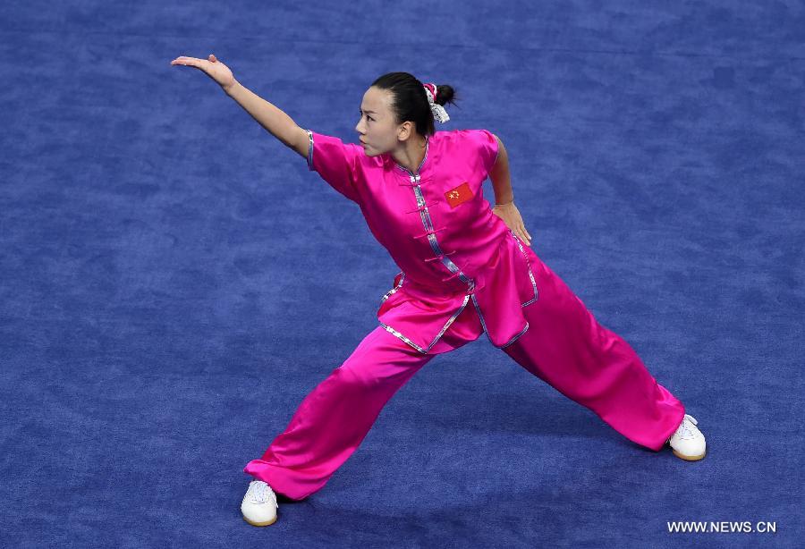 Kan Wencong of China performs during the women's Changquan final of Wushu competition at the 17th Asian Games in Incheon, South Korea, Sept. 23, 2014. Kan Wencong won the gold medal. (Xinhua/Lin Yiguang)