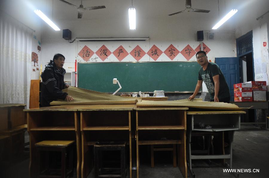Government staff prepare beds in Hepu Primary School at Hepu Township of Xiangshan County, east China's Zhejiang Province, Sept. 22, 2014. The 16th typhoon (tropical storm level) this year made the 4th landfall in Hepu Township of Xiangshan County in Zhejiang Province at 7:35 p.m. on Monday. (Xinhua/Han Chuanhao)