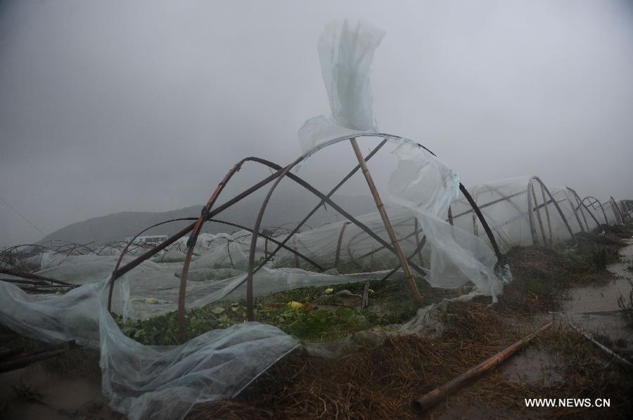 | Green house is destroyed by rain storm at Gaotang Township of Xiangshan County, east China's Zhejiang Province, Sept. 22, 2014. The 16th typhoon (tropical storm level) this year made the 4th landfall in Hepu Township of Xiangshan County in Zhejiang Province at 7:35 p.m. on Monday. (Xinhua/Han Chuanhao) |
