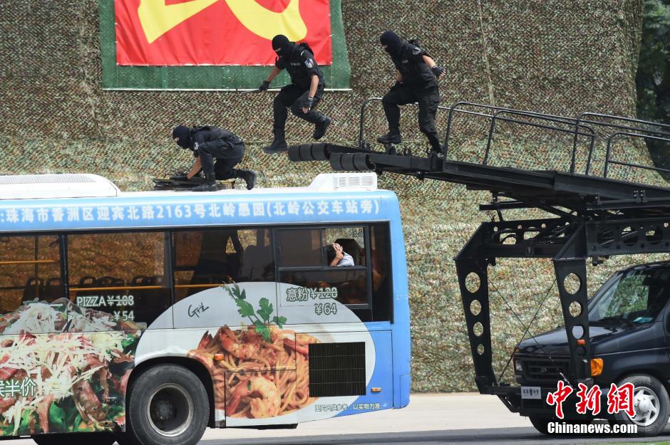 Guangdong police conduct 2014 anti-terrorism exercise in Guangzhou, capital city of south China’s Guangdong province on Sept. 20, 2014. The exercise was based on a real case. 1,825 policeman and soldiers took part in the anti-terrorism maneuvers such as assaulting, using patrol dogs to fight terrorism, shooting, rescuing hostage, etc. (Photo/Chinanews.com)