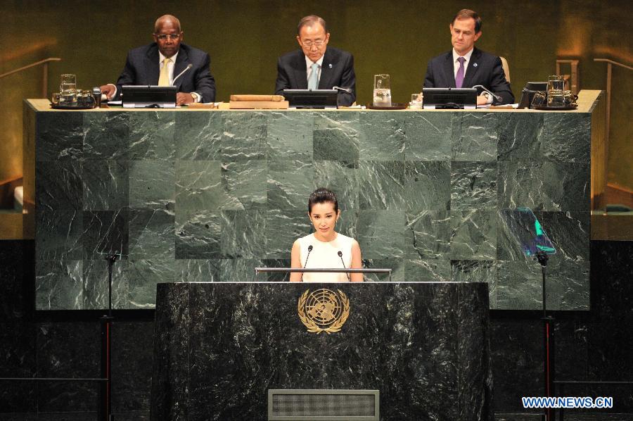 Li Bingbing (front), actress and UN Environment Programme Goodwill Ambassador, speaks during the opening ceremony of the Climate Summit at the UN headquarters in New York, on Sept. 23, 2014. The one-day summit, convened by UN Secretary-General Ban Ki-moon, is expected to galvanize global action on climate change. (Xinhua/Niu Xiaolei)