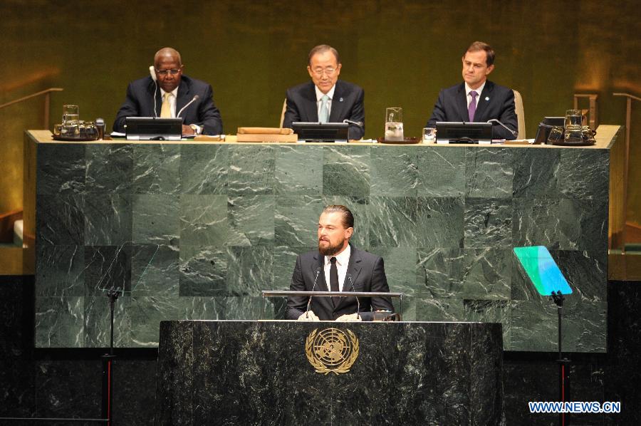 Leonardo DiCaprio (front), actor and UN Messenger of Peace, speaks during the opening ceremony of the Climate Summit at the UN headquarters in New York, on Sept. 23, 2014. The one-day summit, convened by UN Secretary-General Ban Ki-moon, is expected to galvanize global action on climate change. (Xinhua/Niu Xiaolei)