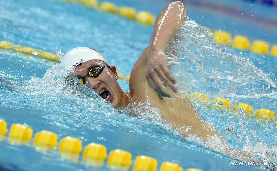 Huang Chaosheng of China swims during the preliminary match of men's 400m individual medley swimming at the 17th Asian Games in Incheon, South Korea, Sept. 24, 2014. Huang Chaosheng advanced to the final with 4 minutes and 19.13 seconds. (Xinhua/Gong Lei)