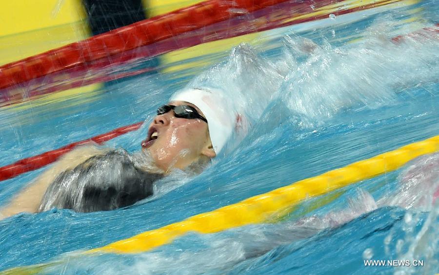 Wang Xueer of China swims during the preliminary match of women's 100m backstroke swimming at the 17th Asian Games in Incheon, South Korea, Sept. 24, 2014. Wang Xueer advanced to the final with 1 minute and 01.39 seconds. (Xinhua/Gong Lei)