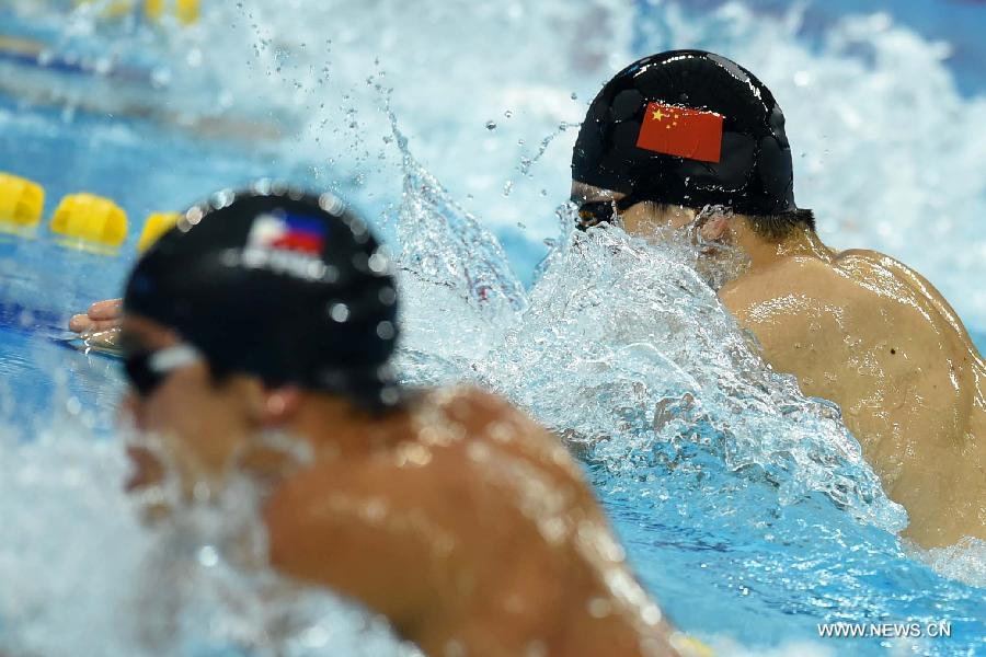 Mao Feilian (R) of China swims during the preliminary match of men's 100m breaststroke swimming at the 17th Asian Games in Incheon, South Korea, Sept. 24, 2014. Mao Feilian advanced to the final with 1 minute and 02.76 seconds. (Xinhua/Gong Lei)