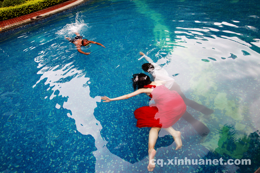 A new couple takes underwater wedding photos in Nanan District, Chongqing, on Sept. 1, 2014. (Xinhua News Agency/Pengbo)
