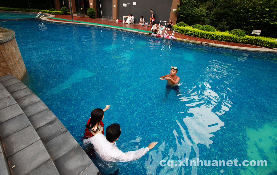A photographer teaches a new couple how to pose in Nanan District, Chongqing, on Sept. 1, 2014. (Xinhua News Agency/Pengbo)