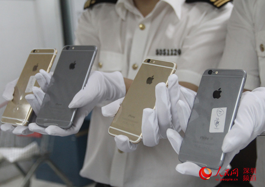 iPhone 6 smartphones seized by Shenzhen Customs are displayed on Sept. 22, 2014. Shenzhen Customs officers first seized three SLR camera lens in a man’s backpack, then eight new iPhone6 smartphones in three underpants he wore, worth about 40,000 yuan. Recently, more than 2,000 iPhone 6 smartphones have been confiscated since they hit shelves in Hong Kong last Friday. Some smugglers admitted to attempting to smuggle the new Smartphone onto the mainland, where they are still not legally available. (Photo: Shenzhen Customs)