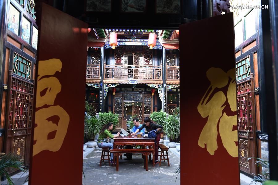 Tourists chat in a local inn in Pingyao County, north China's Shanxi Province, Sept. 19, 2014. Located in Jinzhong Basin of Shanxi Province, the 2700-year-old Pingyao Ancient Town is one of the most well-preserved ancient towns in China. Pingyao, which was added to the World Heritage List by UNESCO in 1997, attracts numerous tourists from all over the world. (Xinhua/Yan Yan)