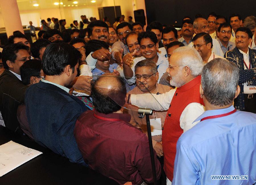 Indian Prime Minister Narendra Modi (2nd R, front) greets scientists after the Mars Orbiter spacecraft successfully entered the Mars orbit at the Indian Space Research Organisation's Telemetry, Tracking and Command Network in Bangalore, India, Sept. 24, 2014. India Wednesday scripted history by becoming the world's first country to reach Mars in its maiden attempt. (Xinhua/Indian Press Information Bureau)