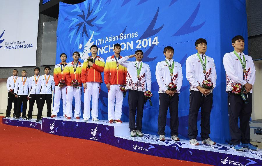 Gold medalists swimmers of China, silver medalists swimmers of Japan and bronze medalists swimmers of South Korea pose on the podium during the awarding ceremony of the men's 4×100m freestyle relay contest of swimming event at the 17th Asian Games in Incheon, South Korea, Sept. 24, 2014. China won the gold medal with 3 minutes and 13.47 seconds. (Xinhua/Wang Peng)