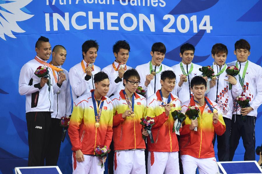 Gold medalists swimmers of China, silver medalists swimmers of Japan and bronze medalists swimmers of South Korea pose on the podium during the awarding ceremony of the men's 4×100m freestyle relay contest of swimming event at the 17th Asian Games in Incheon, South Korea, Sept. 24, 2014. China won the gold medal with 3 minutes and 13.47 seconds. (Xinhua/Gong Lei)