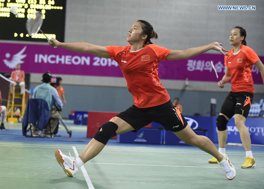 Tian Qing (L) of China returns the shuttlecock during the women's doubles quarterfinal match of badminton against Kim Hana and Jung Kyungeun of South Korea at the 17th Asian Games in Incheon, South Korea, Sept. 25, 2014. Tian Qing and Zhao Yunlei won 2-1. (Xinhua/Ye Pingfan)
