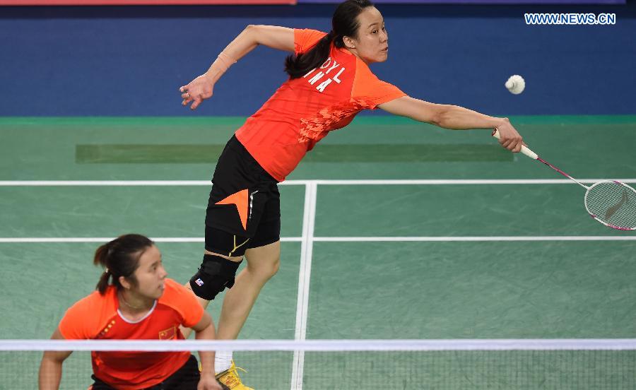 Zhao Yunlei (R) of China returns the shuttlecock during the women's doubles quarterfinal match of badminton against Kim Hana and Jung Kyungeun of South Korea at the 17th Asian Games in Incheon, South Korea, Sept. 25, 2014. Tian Qing and Zhao Yunlei won 2-1. (Xinhua/Ye Pingfan)