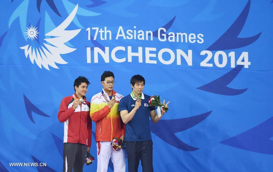 Gold medalist Shi Yang (C) of China, silver medalist Schooling Joseph Isaac (L) of Singapore and bronze medalist Yang Jungdoo of South Korea pose on the podium during the awarding ceremony of the men's 50m butterfly contest of swimming event at the 17th Asian Games in Incheon, South Korea, Sept. 25, 2014. Shi Yang won the gold medal with 23.46 seconds. (Xinhua/Lin Yiguang)