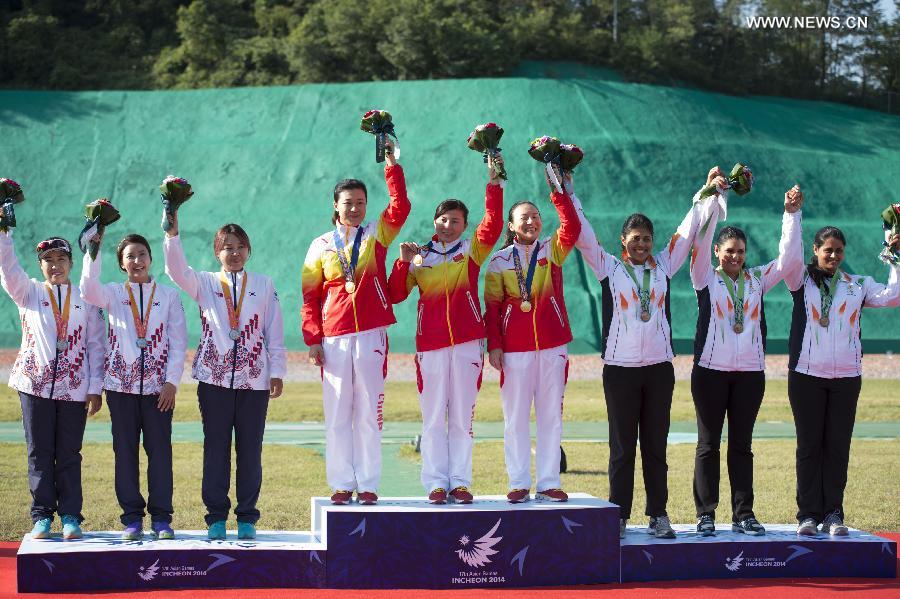 Gold medalists athletes of China (C), silver medalists athletes of South Korea (L) and bronze medalist athletes of India pose during the awarding ceremony of the double trap women's team of shooting competition at the 17th Asian Games in Incheon, South Korea, Sept. 25, 2014. (Xinhua/Lui Siu Wai)