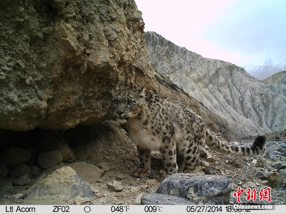 Snow leopard is taken pictures by camara for the first time in field in natural reserve area of Tibet's Mount Qomolangma, Sept. 24, 2014. (Photo source:chinanews.com)