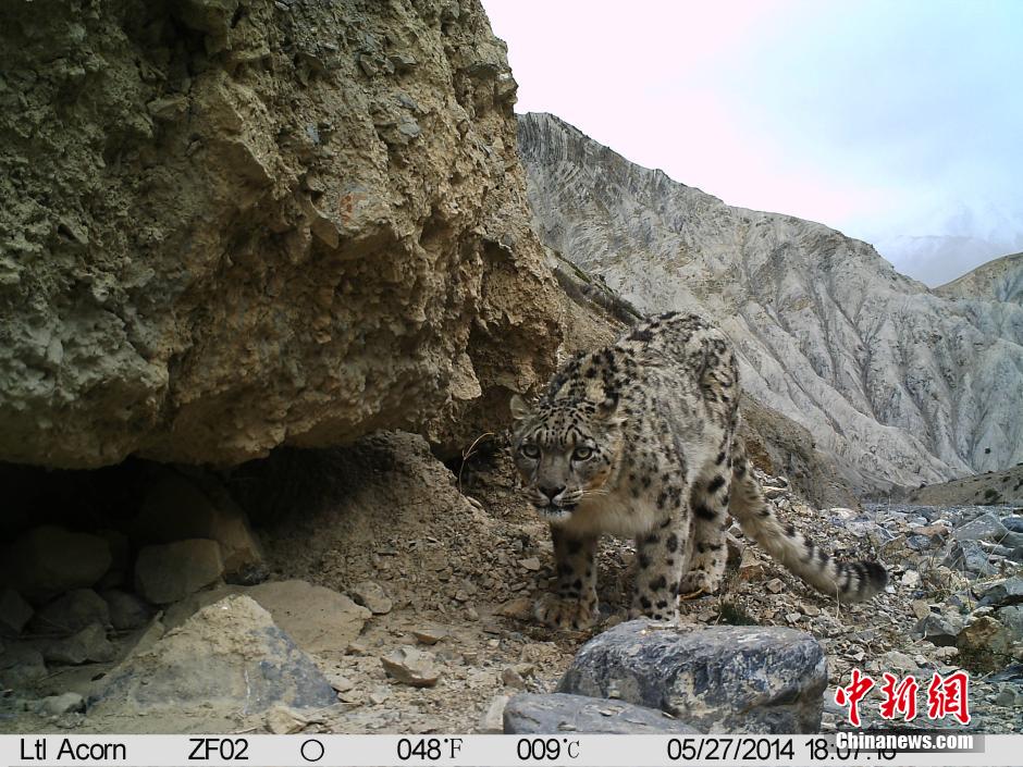 Snow leopard is taken pictures by camara for the first time in field in natural reserve area of Tibet's Mount Qomolangma, Sept. 24, 2014. (Photo source:chinanews.com)