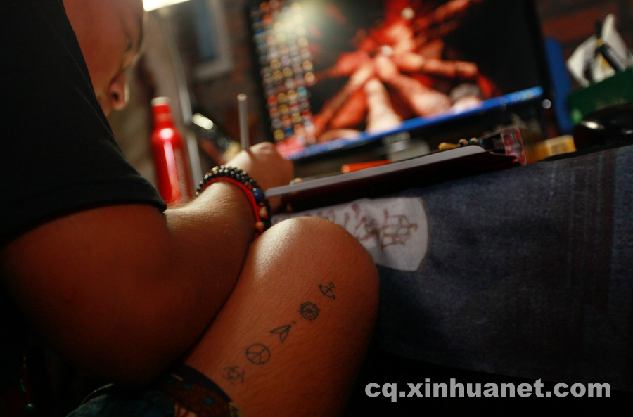 Pan's assistant creates his tattoo works on July 21, 2014. "At first, I tattoo myself. It is cool and interesting," he said. (Xinhua News Agency/Peng Bo)