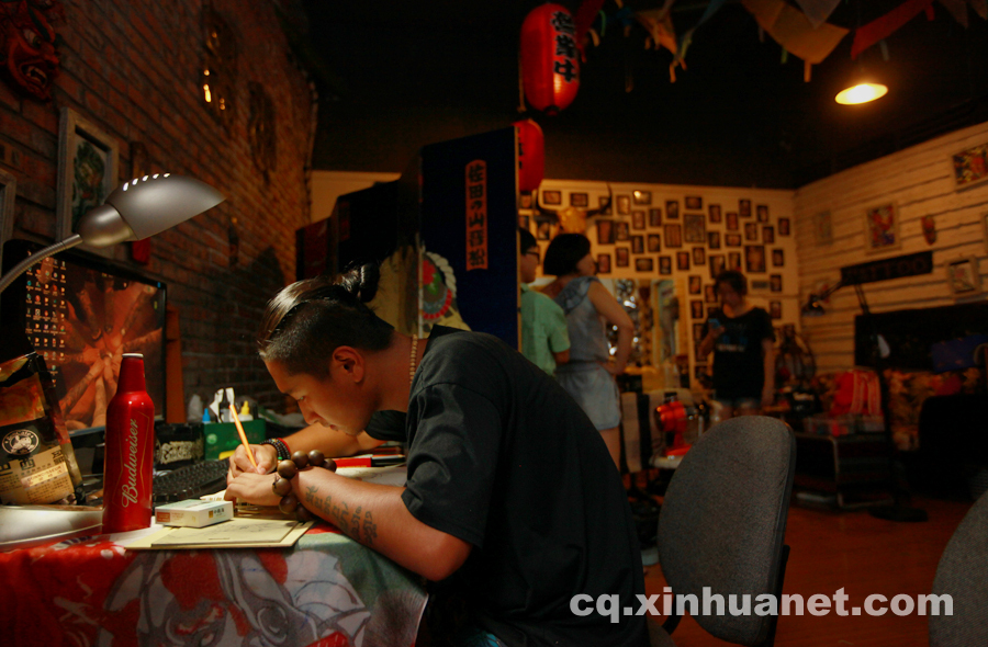 Pan's assistant creates his tattoo works on July 21, 2014. Pan graduated from an academy of fine art; his dream is to open a tattoo shop. "My family support fully on my career and my dream, they don't think it is odd or weird," he said. (Xinhua News Agency/Peng Bo)