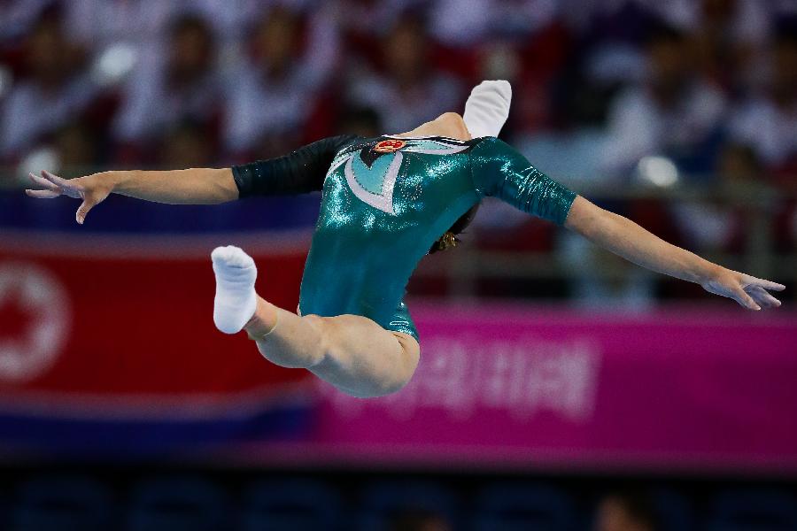 Yao Jinnan of China performs during the women's floor exercise final of gymnastics artistic event at the 17th Asian Games in Incheon, South Korea, Sept. 25, 2014. Yao Jinnan claimed the title with 13.966 points. (Xinhua/Zheng Huansong)