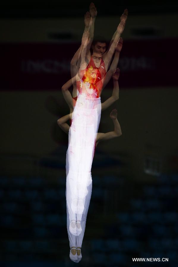 Tu Xiao of China competes during the men's final of gymnastics trampoline event at the 17th Asian Games in Incheon, South Korea, Sept. 26, 2014. Tu Xiao got the silver medal with 60.435 points. (Xinhua/Zheng Huansong)