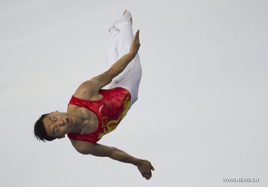 Dong Dong of China competes during the men's final of gymnastics trampoline event at the 17th Asian Games in Incheon, South Korea, Sept. 26, 2014. Dong Dong won the gold medal with 62.480 points. (Xinhua/Lui Siu Wai)