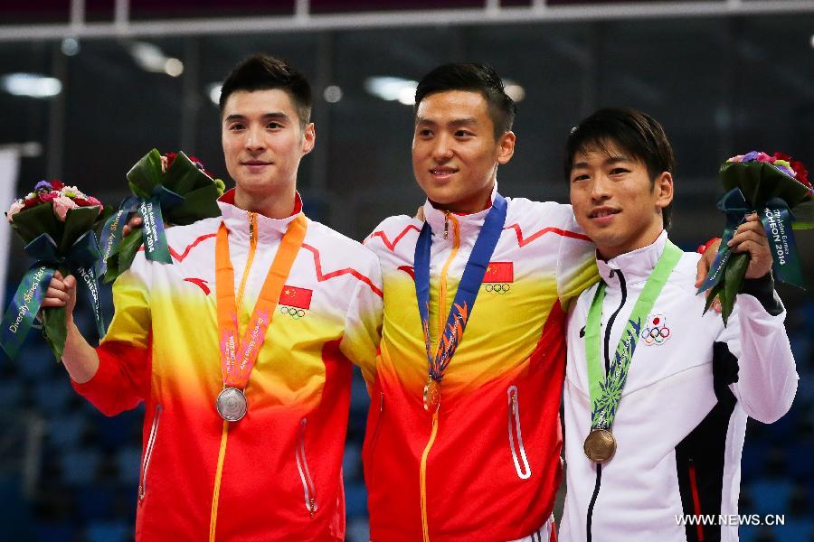 Gold medalist Dong Dong (C), silver medalist Tu Xiao (L) of China, and bronze medalist Ueyama Yasuhiro of Japan pose on the podium during the awarding ceremony of the men's gymnastics trampoline event at the 17th Asian Games in Incheon, South Korea, Sept. 26, 2014. Dong Dong won the gold medal with 62.480 points. (Xinhua/Zheng Huansong)