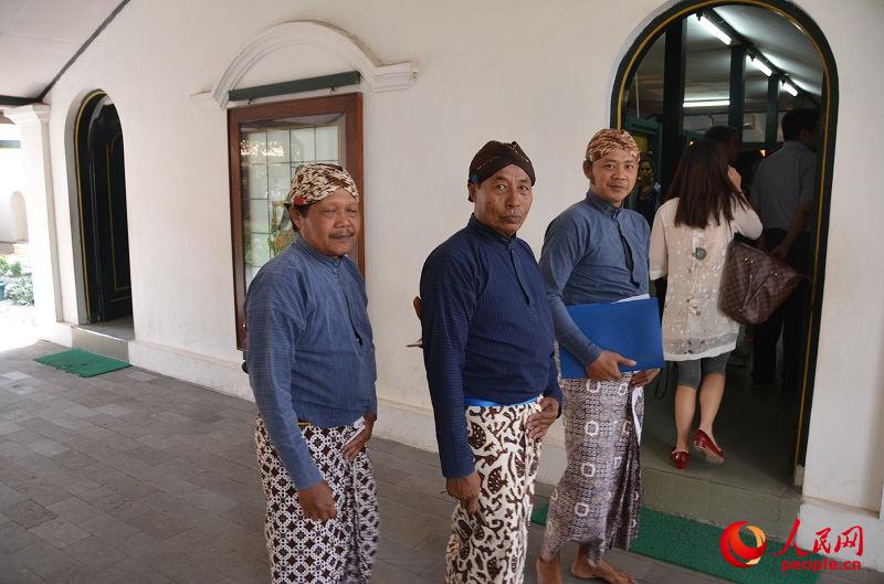 The body guards in palace wear round caps, sarong, slippers and Batik dresses, with Kris in their wrestles. There dressing and duties remain unchanged for hundreds of years. (People's Daily Online/Yang Mu)