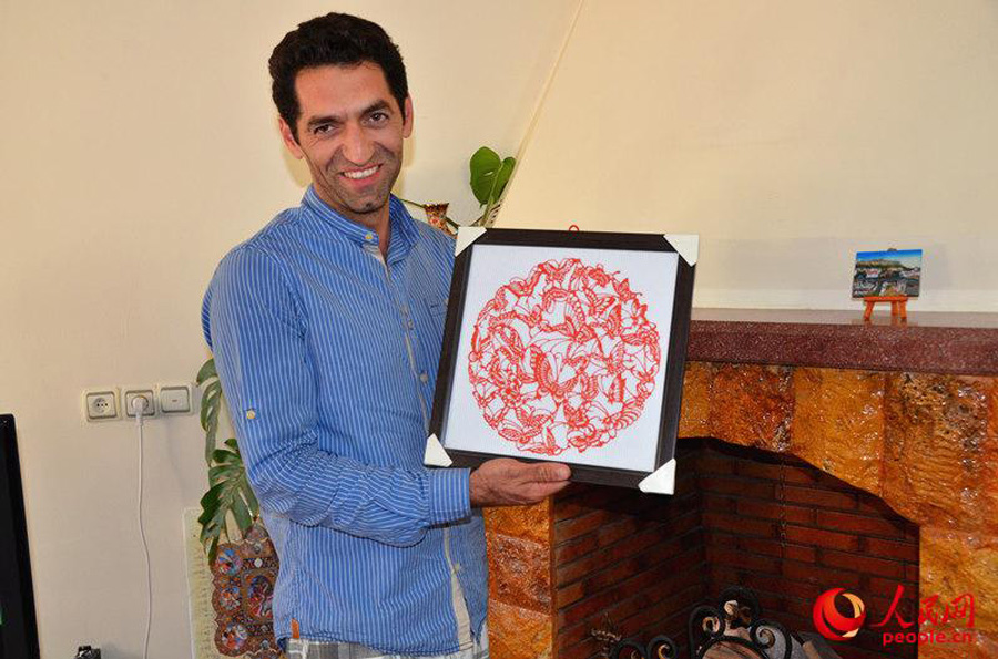 Slosa likes the art of Chinese paper-cutting very much. He shows the reporters his collections of Chinese paper cutting. (Jia Xingpeng/People's Daily Online)
