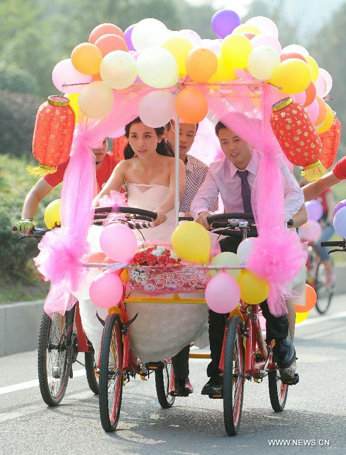 Bride Jiang Yan and bridegroom Huang Bo ride a four-wheel wedding bicycle in Changsha, capital of central China's Hunan Province, Sept. 27, 2014. The couple, together with their riding mates, celebrated their wedding by riding bicycles on Saturday. (Xinhua/Li Ga)